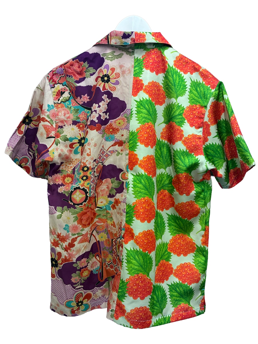 左身頃にはデッドストックの未使用の着物生地を使用。右身頃にはポリエステル生地に新たなデザインをプリントしました。伝統的な日本の美しさと現代的な感性を融合させたサステナブルな一着です。