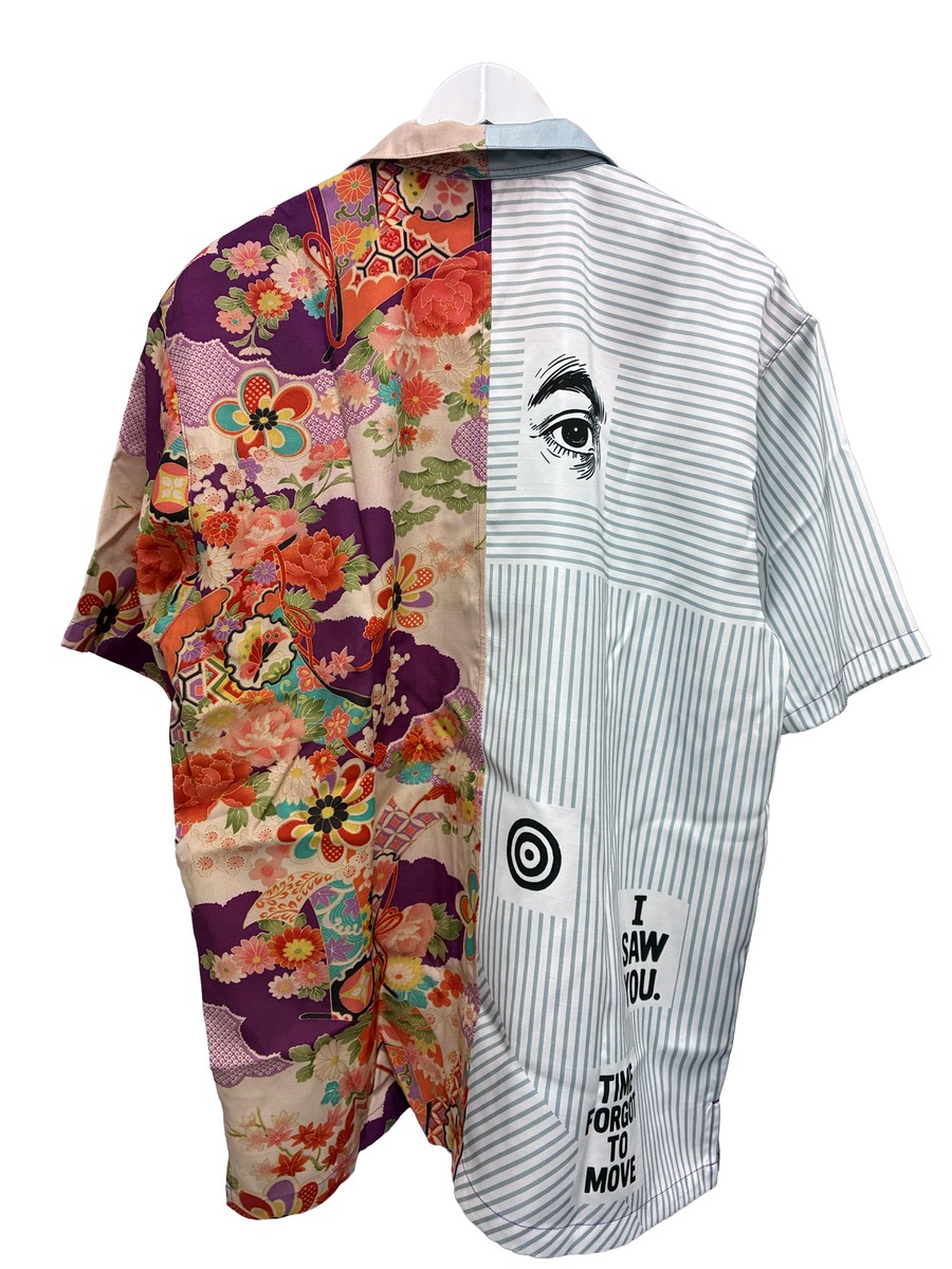 左身頃にはデッドストックの未使用の着物生地を使用。右身頃にはポリエステル生地に新たなデザインをプリントしました。伝統的な日本の美しさと現代的な感性を融合させたサステナブルな一着です。