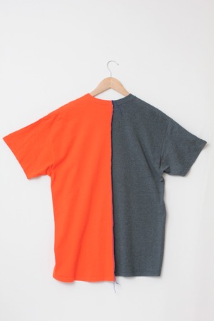2着のユーズドをつなぎ合わせたアシンメトリーなTシャツです。