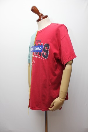 2着のユーズドをつなぎ合わせたアシンメトリーなTシャツです。